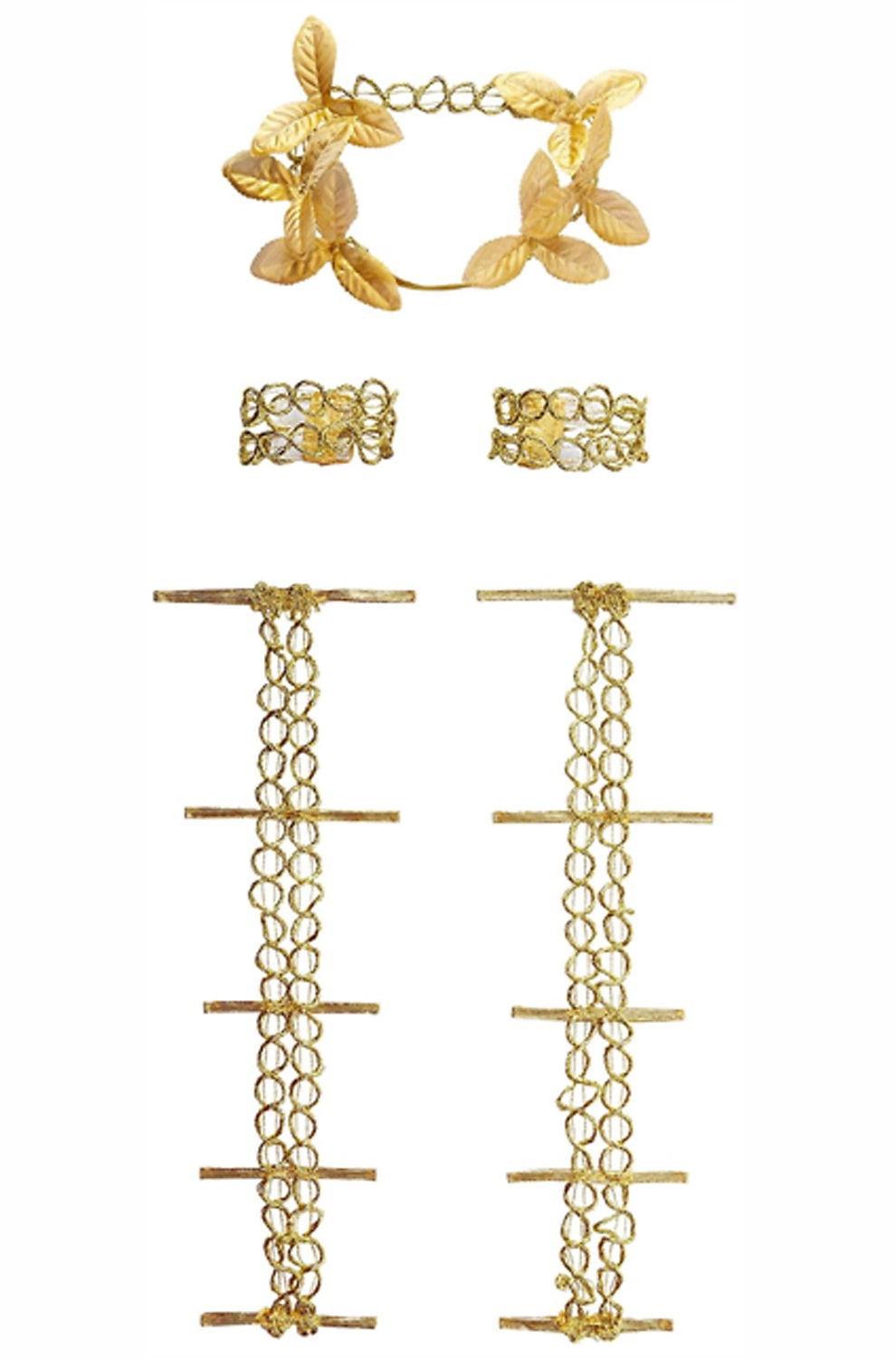 Unleash your inner goddess with this golden Goddess Kit. This costume kit features all the essentials you need to look like you’ve just descended from Mount Olympus. The kit includes a gold leaf headpiece, gold cuffs, and leg ties to turn any pair of heels to gladiator style shoes. Wear this kit with your favorite flowy gown and you can instantly become a heavenly Greek goddess.