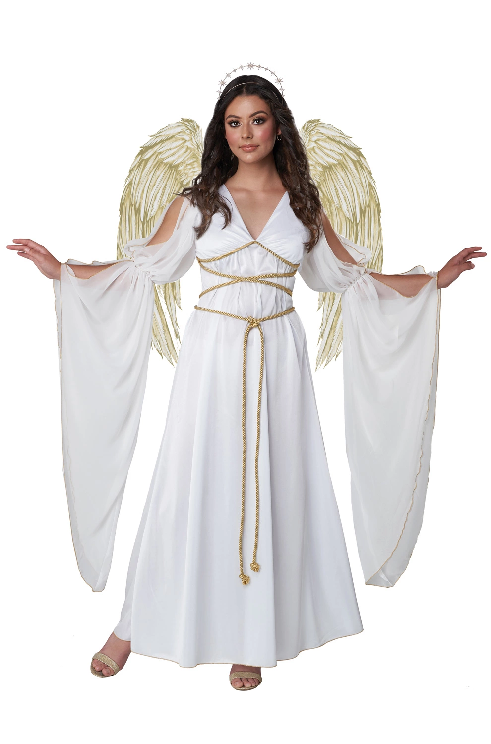 If you are looking for an angel costume that is out of this world, this costume is sure to take your breath away! With beautiful long sleeves, golden wings and a celestial inspired halo, this costume will turn heads. Wear it for Halloween, plays, or Christmas events and all eyes will be on you. Everyone will be so impressed by your costume!