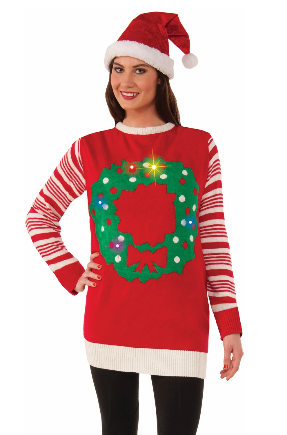 Bring Christmas cheer to your holiday party with this Wreath Light Up sweater for adults. This pullover has festive candy cane striped sleeves and a classic wreath adorned with red and white sprinkles and Christmas lights that really work. Everyone’s going to love this bright and cheery sweater.